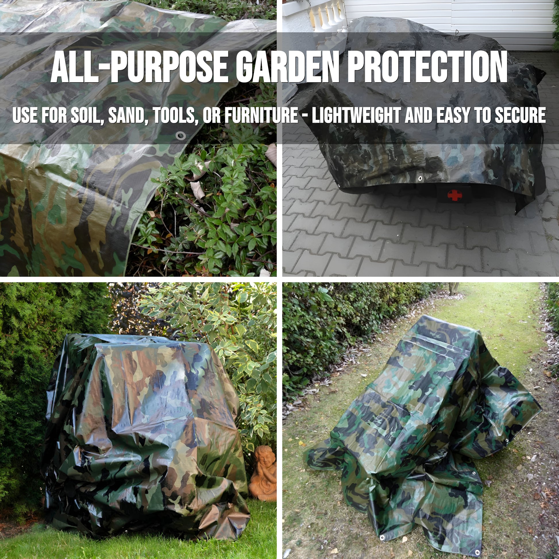 - Discreet Camo Design - Blends naturally into gardens, campsites, and woodland. Perfect for camping, fishing, hunting, and bushcraft, where a low-visibility waterproof sheet is required.