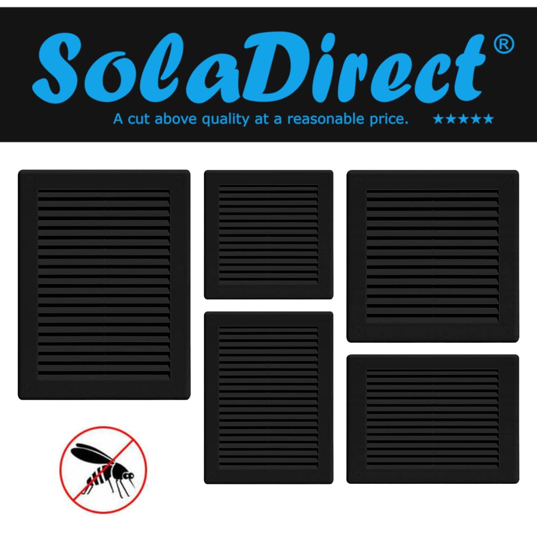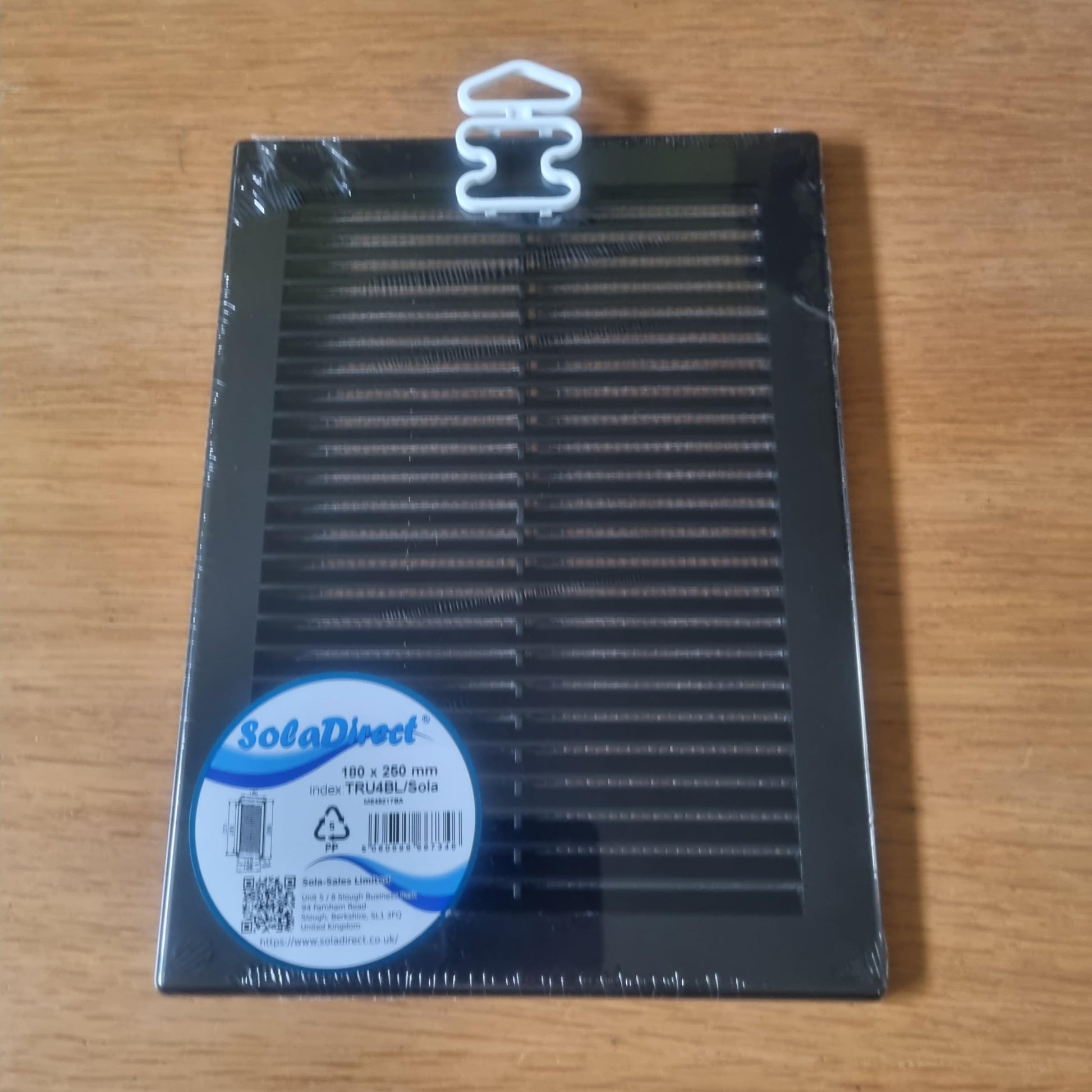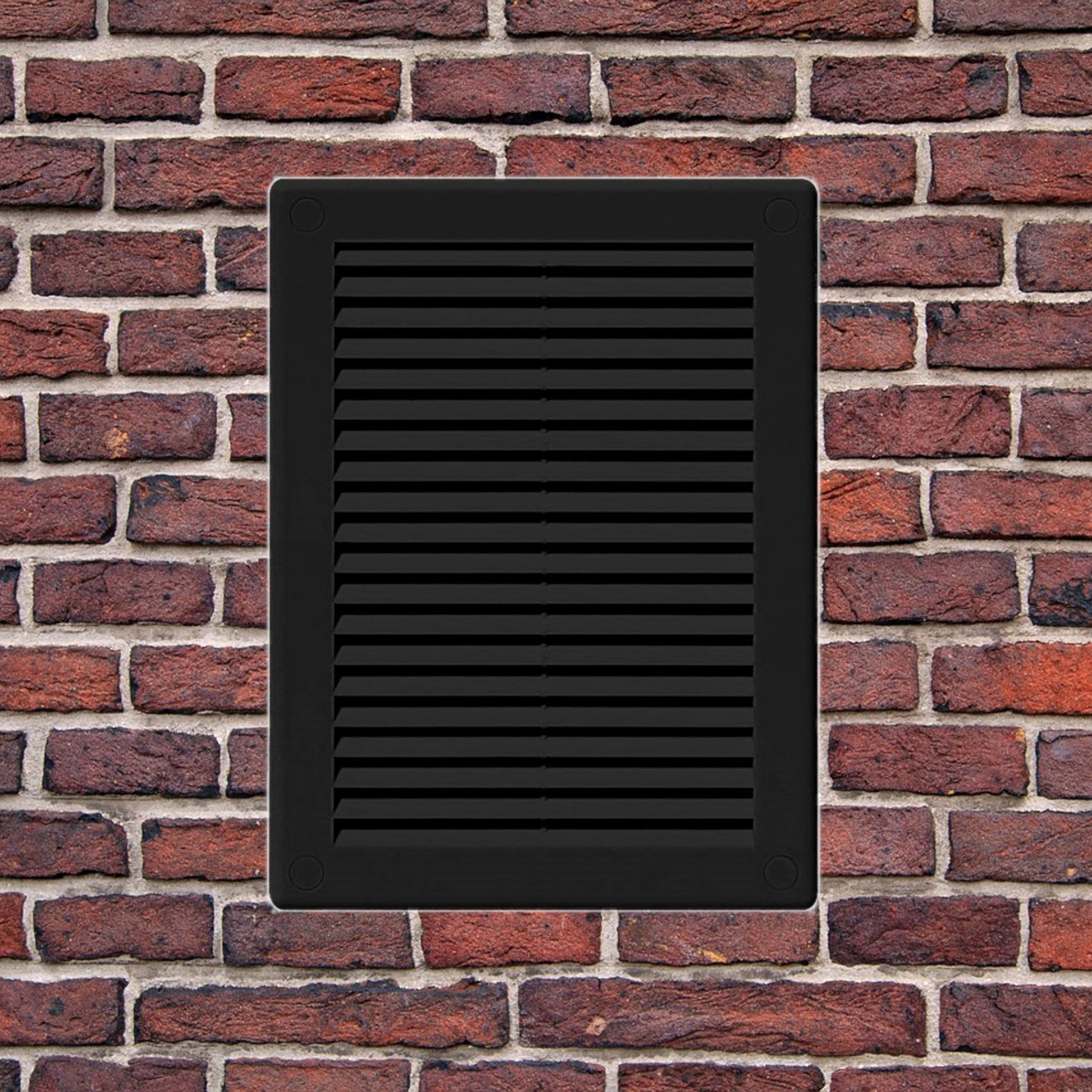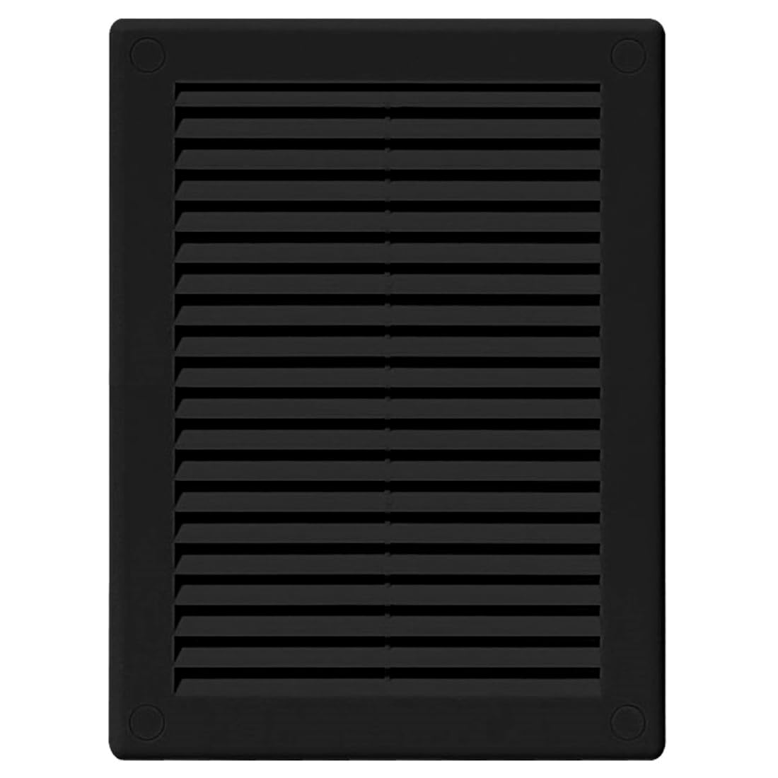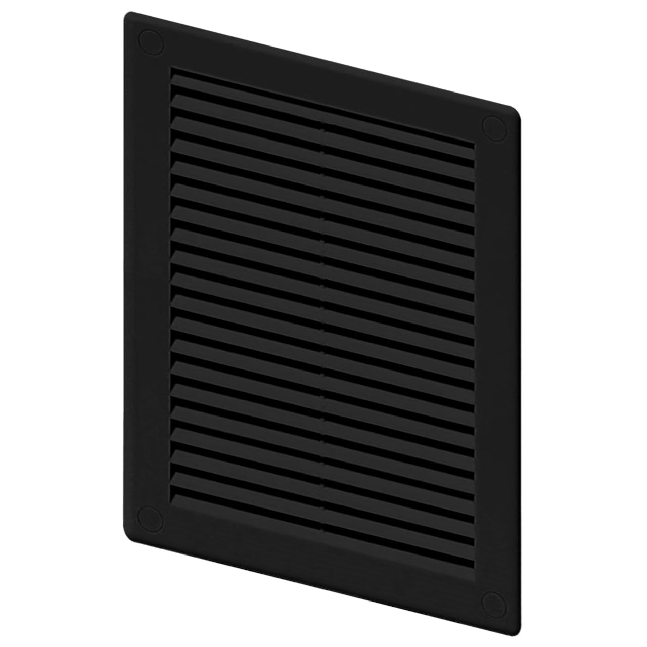 Black Louvred Wall Vent Grille with Flyscreen and Screw Covers, 180 x 250 mm, Air Ventilation Duct Cover with Flat Back