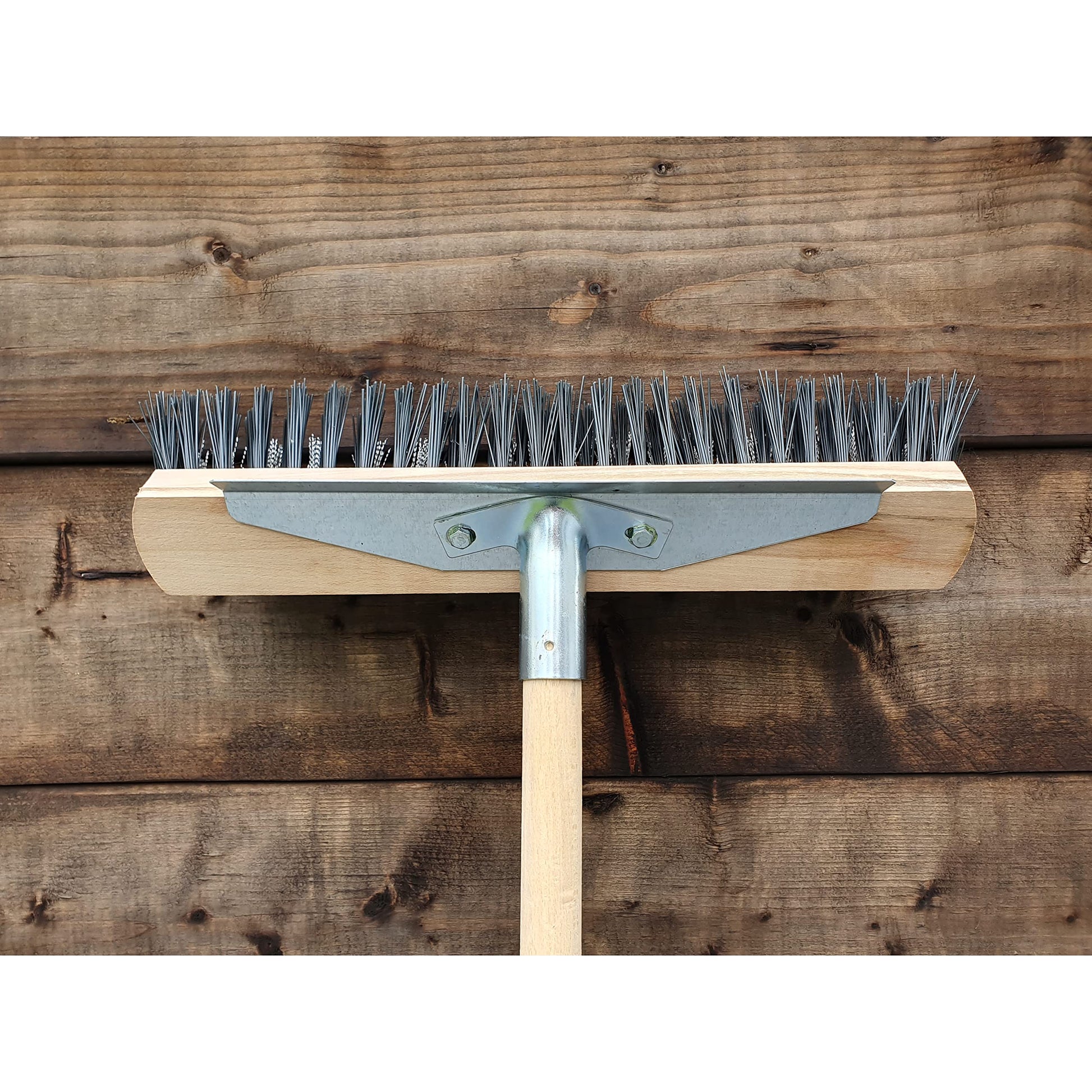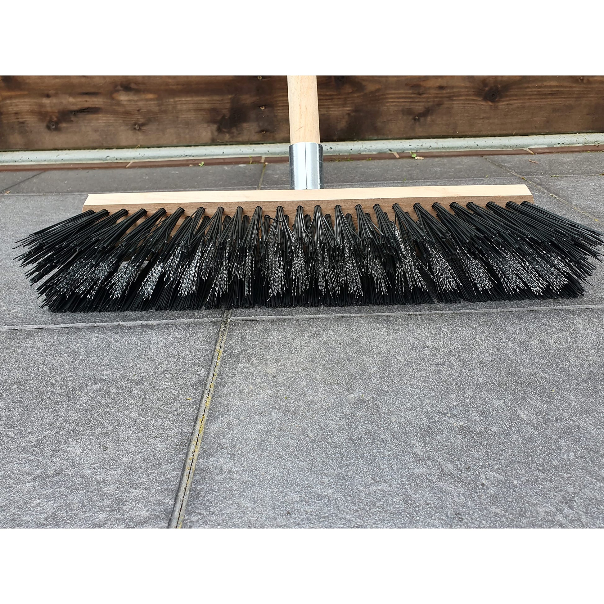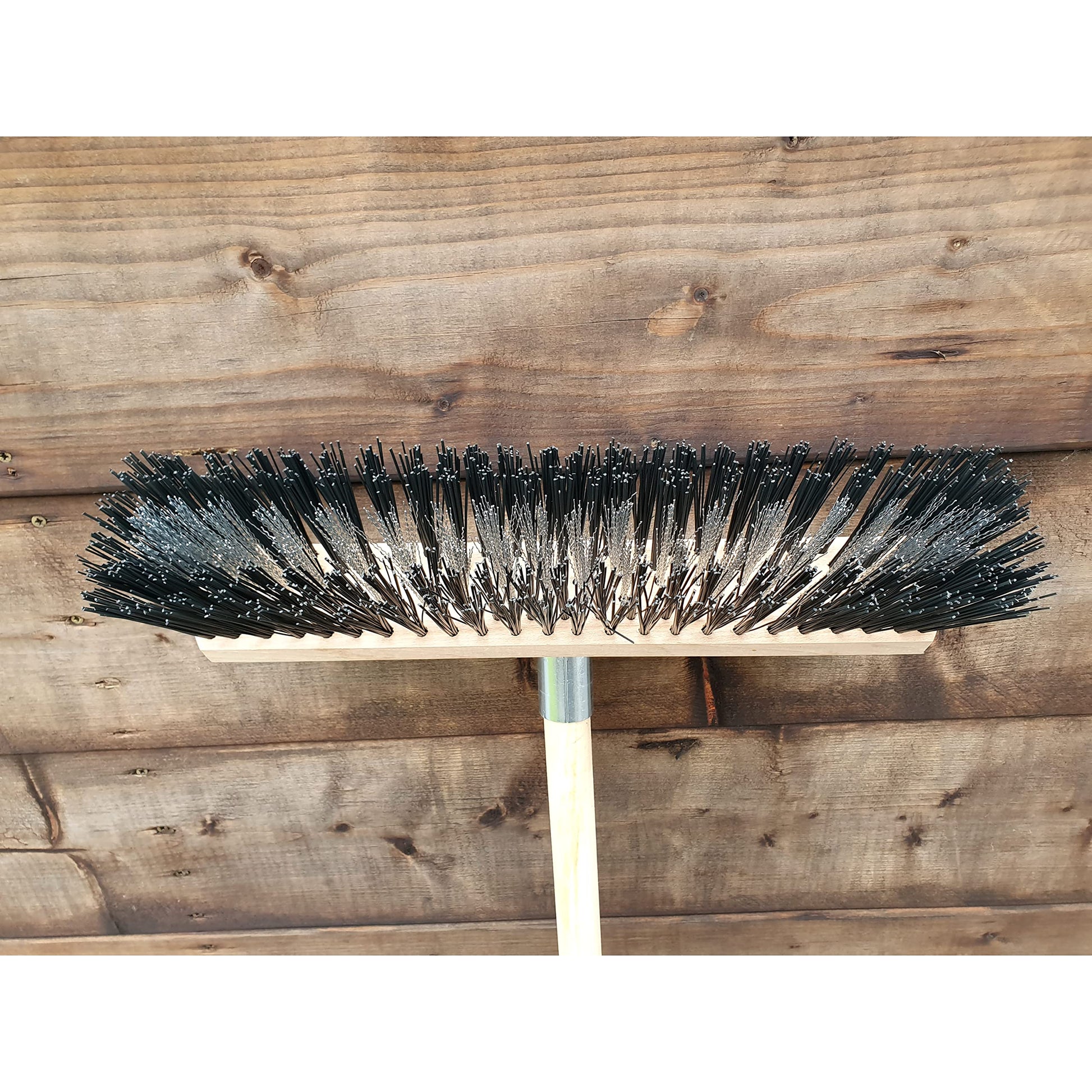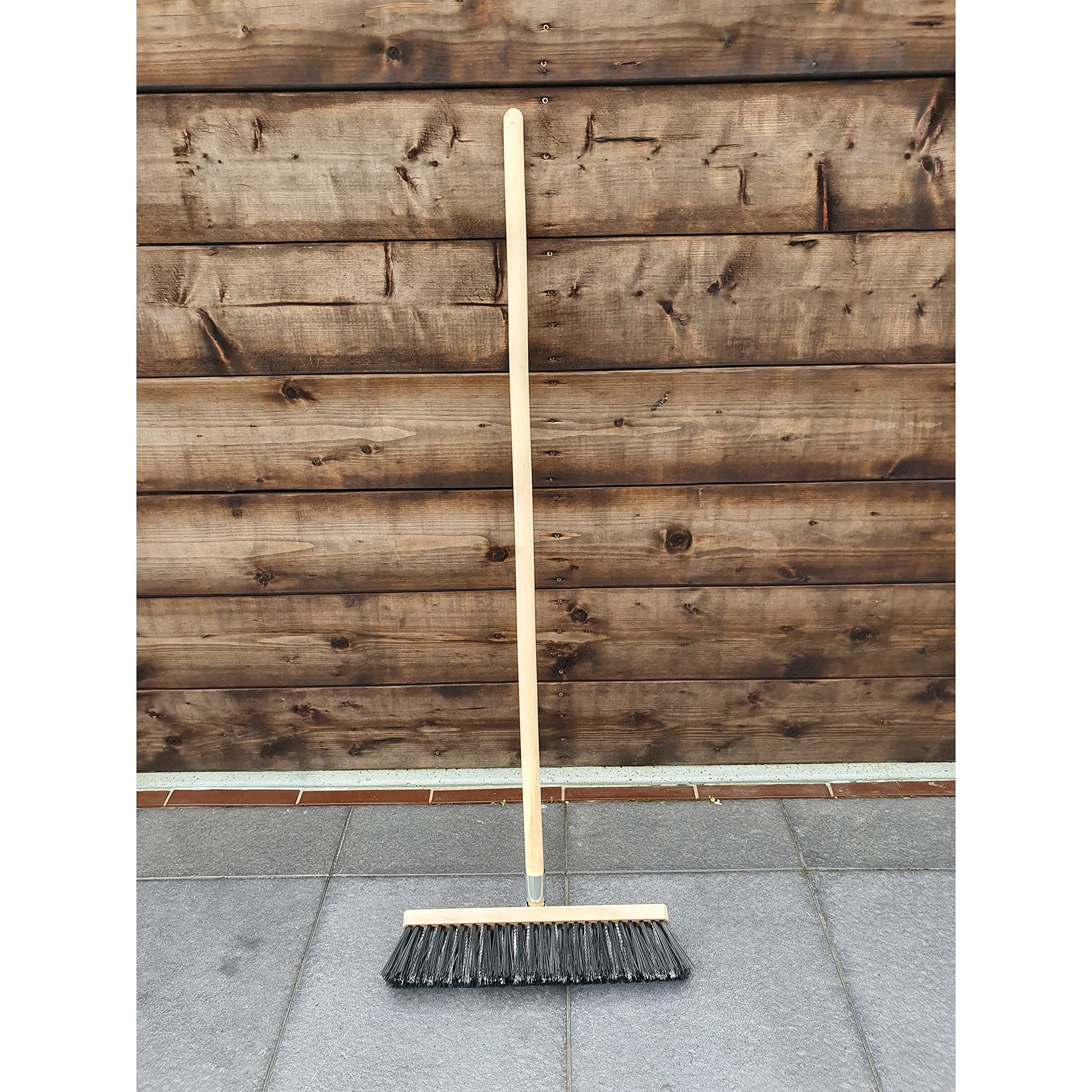 - Broom width: 40 cm / 15.5 in. The bristles in the brush are hard and long (13 cm / 5 in). 115 cm / 45 in long wooden handle included.
