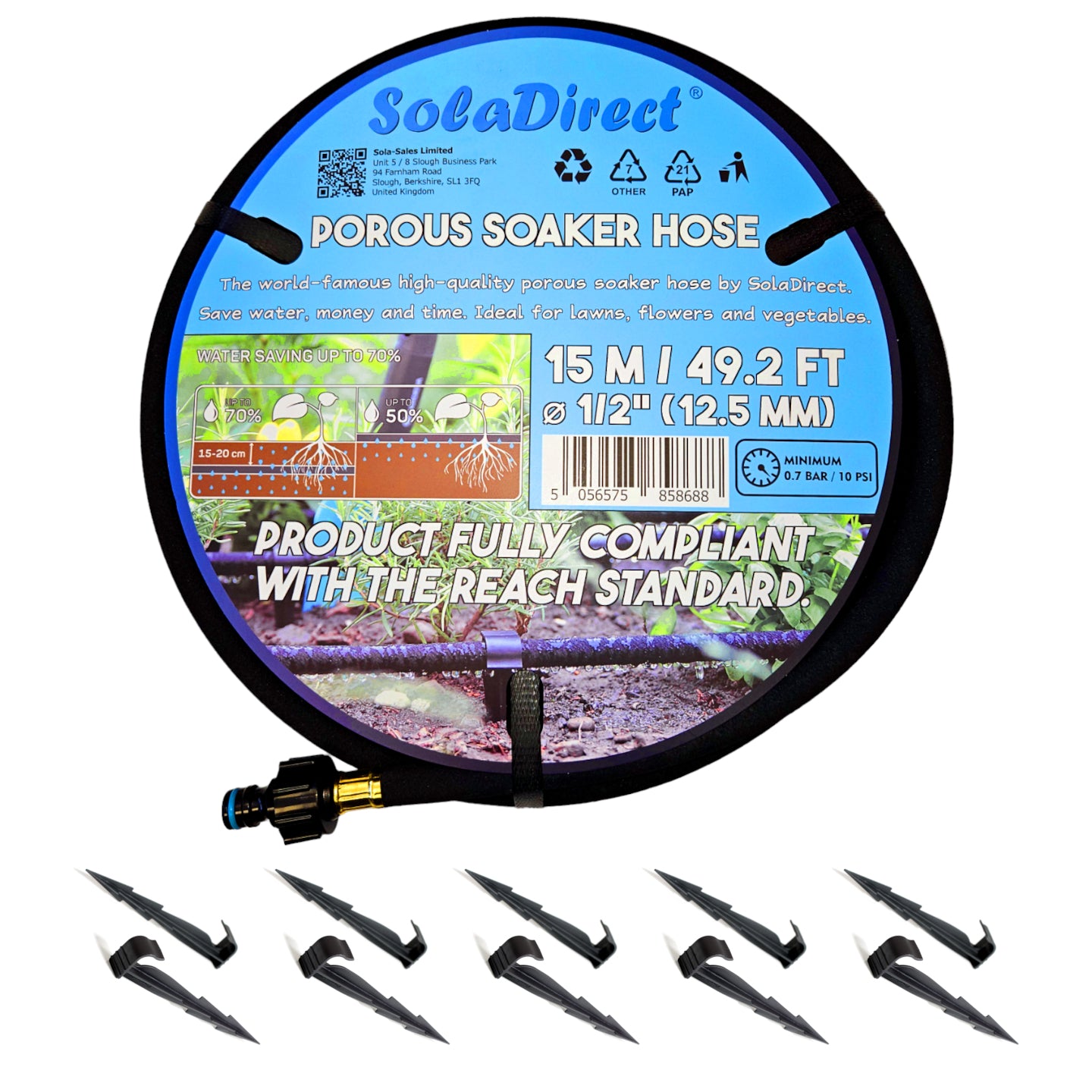 Soaker Hose, Porous Pipe, 15 m / 49.2 ft Long with Connectors, REACH Compliant, Water Saving up to 70% + 10 Ground Pegs