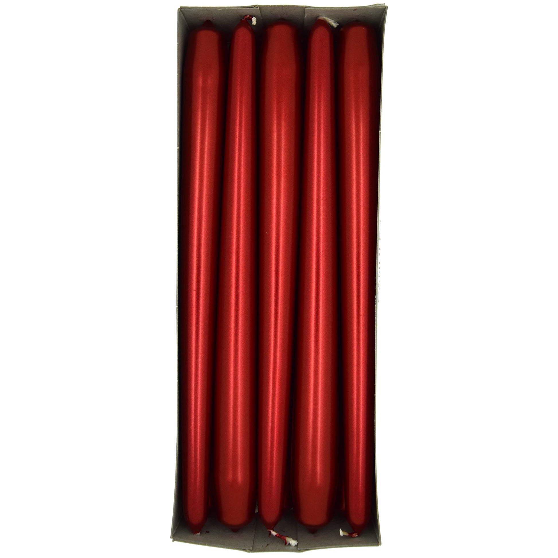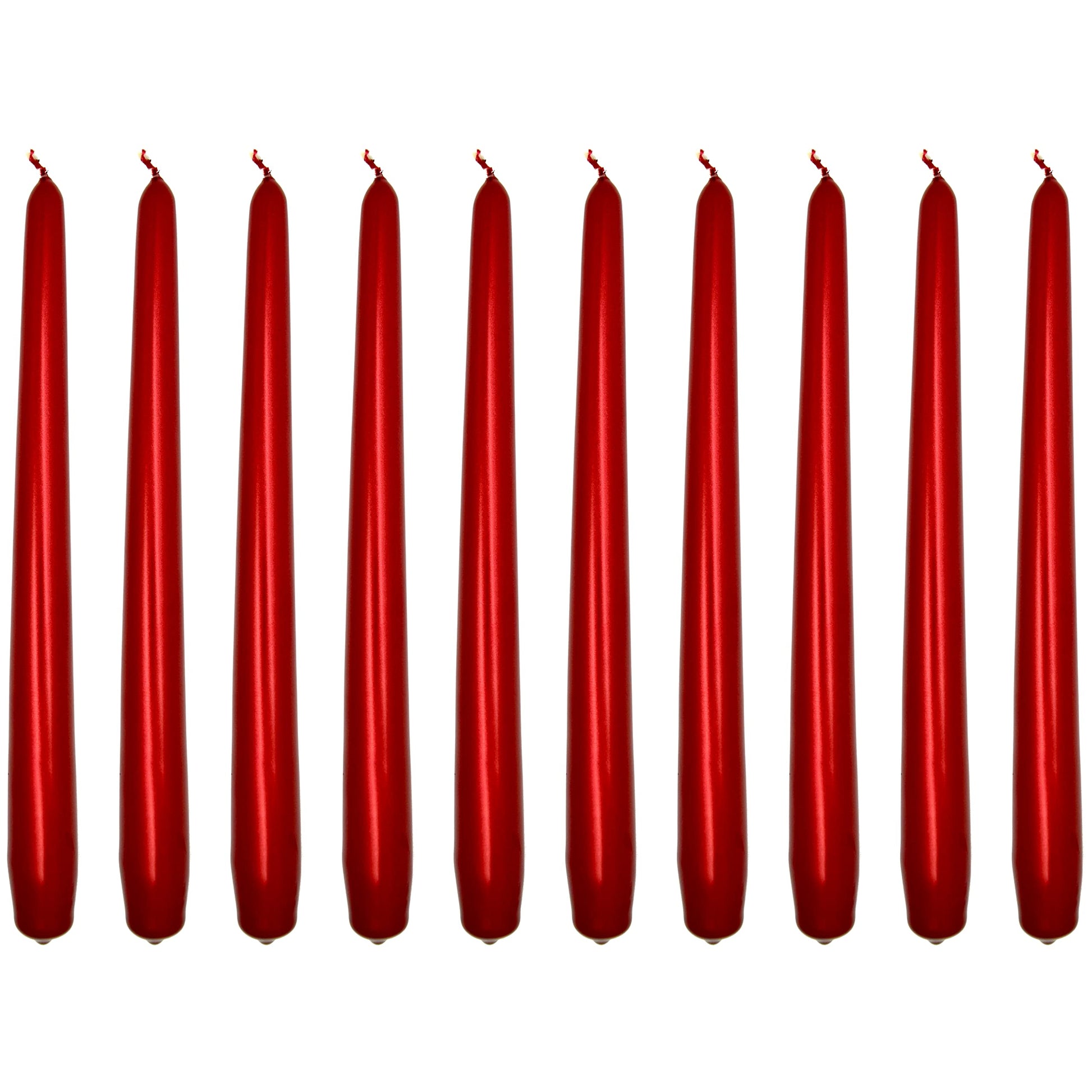 - 10 pcs of 24 cm / 9.45” Red Metallic Long Tapered Dinner Candles. Unscented. 6 hours burning time approx.